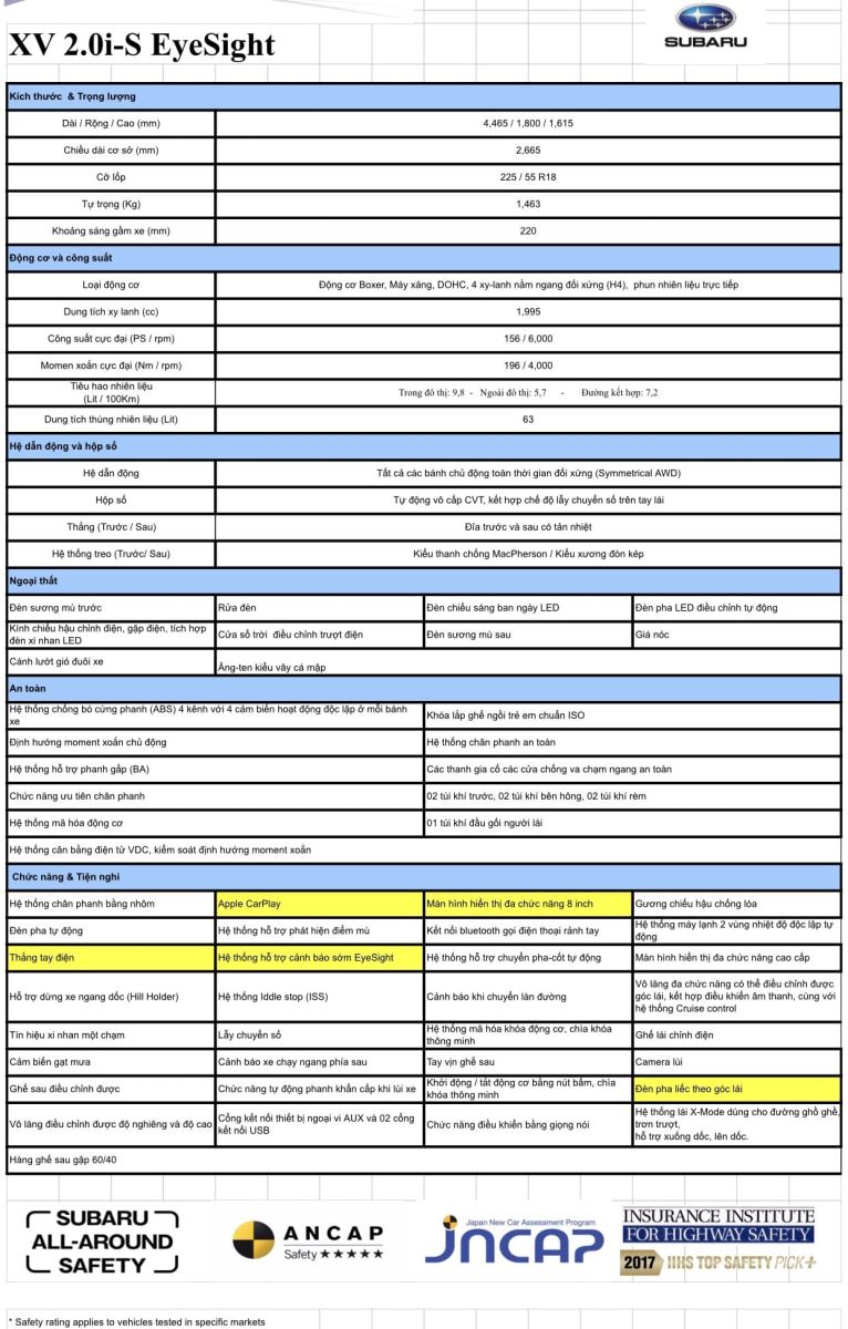Bảng thông số kỹ thuật của xe Subaru XV 2.0 i-S Eyesight